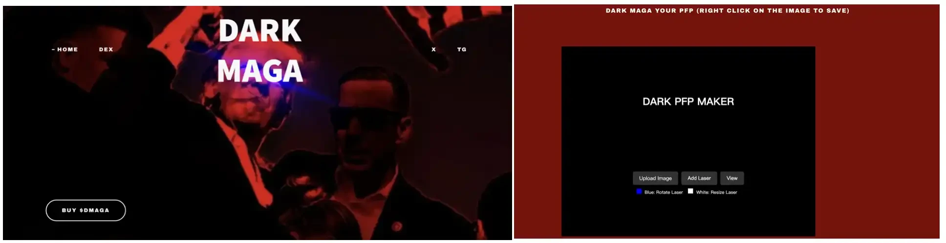 这张图片由一个名为 DarkMagacoin 的网站制作生成,DarkMagacoin 是特朗普枪击案之后,社区基于特朗普著名举拳照片为 IP 推出了一个图片制作网站,以「黑暗 MAGA 爱国者掌控一切」为宣传口号,社区粉丝可以通过官网提供的工具生成同款暗黑激光眼图片。