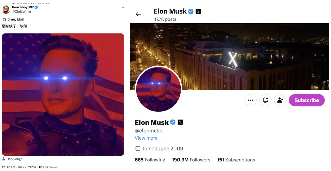 近几日,马斯克在自己的推特账号发文频繁转发美国政治相关内容,旗帜鲜明支持正在参加竞选的特朗普。今日凌晨,一位网友 @Chriswinig 在马斯克凌晨转评纽约犯罪率上升 11% 的 Twitter 下留言说:「It's time!」,附上了一张马斯克原头像带上激光眼的「Dark mask」图片。