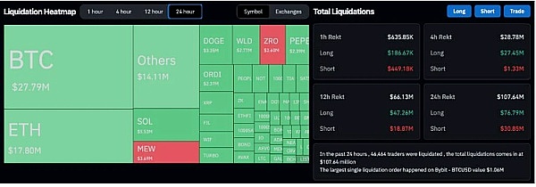 据Coinglass数据显示,过去24 小时,加密货币全网爆仓金额约1.07 亿美元,有超4.6 万人遭清算(多头占约7679 万美元)。