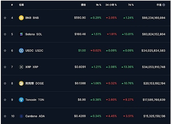 其他前十大代币涨跌不一,涨幅最大的是XRP,近24 小时上涨2.08 %;BNB、SOL、TON、ADA 则分别有约2~4% 的跌幅。