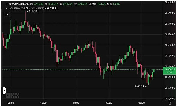 以太坊市场方面就显得弱势的多,截稿前报3454 美元,近24 小时下跌2.38%。