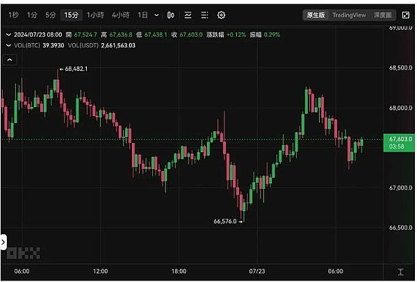加密货币市场方面,比特币昨晚最低来到66,576 美元之后,似乎同样受美股上涨激励开始反弹走高,今(23)晨接近四点时最高来到68,620 美元。截稿前略有下跌现报67,603 美元,近24 小时下跌0.6%。