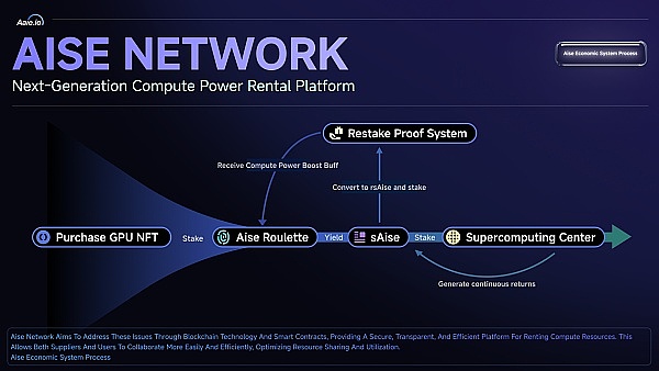 Henry还介绍了Aise Network的四个核心功能,这些功能确保了用户的算力和收益。首先是Aise Roulette 24算力集群系统,通过24层不同算力权重比公平分配用户的质押算力。其次是Aise MProtocol,将20%的算力租赁质押奖励分配给$sAise和$rsAise持有者。第三是算力凝聚系统,每年减少50%的区块奖励,用户可以通过质押GPU NFT卡获取$sAise代币。最后是Restaking Proof系统,通过$sAise、$Aise和$rAise的相互转换加速算力。