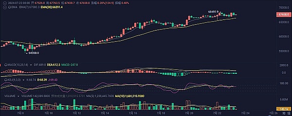 成交量分析:成交量在7月22日02:00达到峰值后逐步减少,与价格反弹时成交量未同步放大相比,这可能预示当前上涨动能不足。最新几个周期成交量稳定,没有明显放量或缩量情况,市场参与度保持一致性。投资者应持续关注成交量变化,以把握市场未来走势。