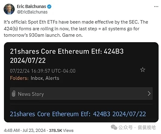 彭博ETF分析师Eric Balchunas推特发文称,美国证监会已正式批准以太币现货ETF,424(b)表格正在陆续递交中,这是最后一步,意味着一切已准备就绪,交易将于美东时间周二上午9时30分(北京时间周二晚间9时30分)启动。