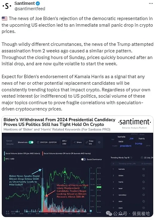 市场情报公司Sentinel指出,对于拜登下台的消息,市场似乎做出了“加密货币价格立即小幅恐慌性下跌”的反应,就像特朗普遇刺的消息一样。
