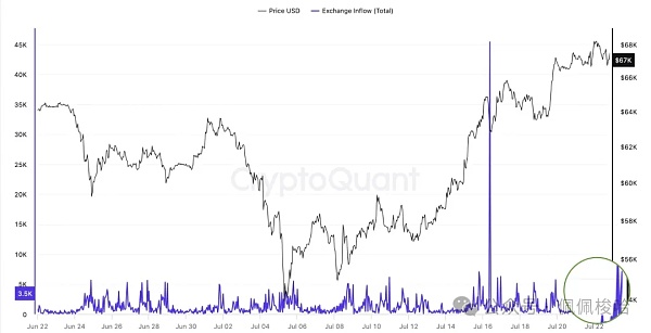 根据区块链数据提供商CryptoQuant数据,周一转移到交易所的比特币数量激增。