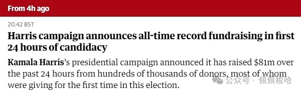 英国《卫报》(The Guardian)报道,哈里斯的总统竞选团队宣布,过去24小时内已从数十万捐助者那里筹集了8100万美元,其中大多数人是首次在本次选举中捐款。