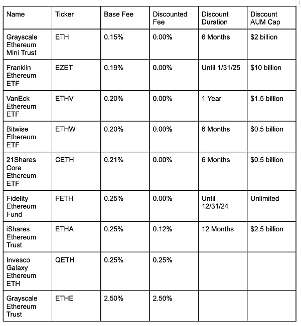 数据供应商晨星的信息显示,在以太坊现货 ETF 的发行人中,除了 Grayscale 之外,大多数都设定了0.19%至0.25%的费率。Grayscale 以太坊信托 ETF 将维持2.5%的费率不变,但在交易的前六个月将豁免最高累计管理资产 20 亿美元的费用。