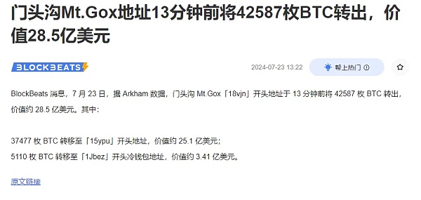 一小时前门头沟Mt.Gox地址13分钟前将42587枚BTC转出,价值28.5亿美元,市场立刻做出回应截至撰稿时比特币距离转账消息公布已下跌约1000美元水平。