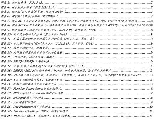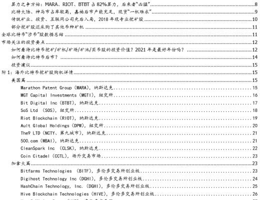 投资建议。建议关注:1)挖矿股:MARA、第九城市、RIOT、BTBT。2)矿机股:嘉楠科技、亿邦国际、英伟达等。3)矿场股:DMGI;4)矿池股(500.com);5)买币股:Microstrategy、特斯拉、GBTC等;6)交易所:火币科技、欧科云链;7)其他:中嘉博创、雄岸科技等。