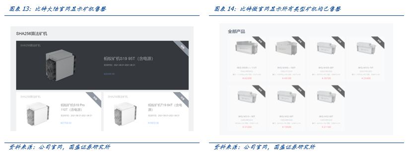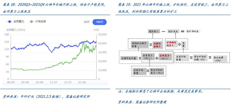 背景:币价上涨,矿机芯片产能受限,利好前期已有较多算力的机构。币价上涨对挖矿收入的影响并非线性的“币价涨—收入增”,要注意的是,1)收入端,矿工可挖得的比特币数量与“自有算力/全网算力”正相关。币价上涨时,理论上全网算力增加,但去年以来,矿机芯片产能受半导体需求紧张,全网算力增加缓慢,因此矿工“自有算力/全网算力”不减,即矿工可挖得的比特币数量不减,利好矿工;3)成本端,由于矿机厂商以回本周期定价,币价上涨时,回本周期缩短,矿机提价,挖矿成本上升,挖矿净收入增加承压,利空矿工。因此,我们认为,短期内挖矿形势利好前期已有较多算力储备的机构,而矿机厂商加码挖矿也将成为行业有力竞争者。