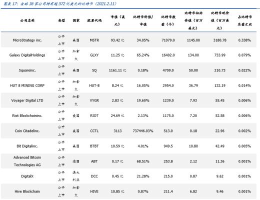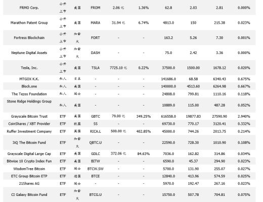 这些公司共分为三种类型:公开上市交易、私人持有、类ETF持有人。其中,持有比特币最多的是美国的Grayscale Bitcoin Trust,高达64.9万个,占比特币总量的3%,价值达360亿美元;上市公司中持有比特币最多的是美国的MicroStrategy,高达71079个(占比特币总量的0.34%),价值达39亿美元。