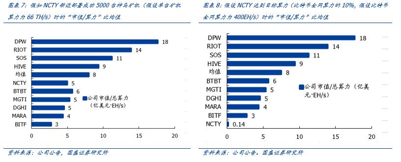 “市值/算力”均值8(即1EH/s算力对应8亿美元市值)。为了更方便地比较资本市场对各公司算力储备的评价,我们定义了“市值/(公司拥有的)算力”比值。我们发现,10家披露了所持算力的海外挖矿股的“市值/算力”均值为8,如果九城达到比特币全网算力的10%,其“市值/算力”比将进一步降低。要强调的是,1)并不是“市值/算力”比越低,公司的挖矿业务越被低估,因为公司可能并不以比特币挖矿为主营业务2)与EPS不同,“市值/算力”仅与公司算力有关(即挖矿收入),而不能反映公司挖矿的成本,例如,比特币牛市时,矿机购入成本走高,挖矿净收入不一定高。