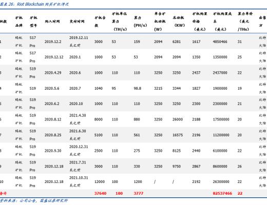加速入场,狂揽算力,MARA、RIOT、BTBT占先发优势,九城增速较快。根据我们的统计,10家披露了所持算力的海外挖矿股共持有近21EH/s比特币算力,占全网16%,而这21EH/s中,MARA、RIOT、BTBT所持算力占82%,分别为10.3 EH/s(52%)、3.8 EH/s(19%)、2.2EH/s(11%),先发优势明显。第九城市在宣布转型后也加了矿机采购力度,增速较快。