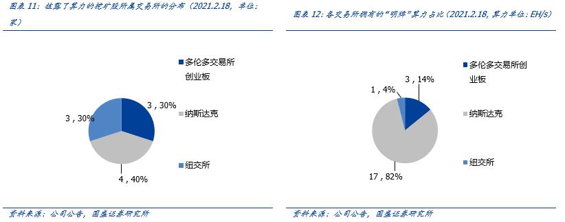 在矿机公司所属的交易所方面也有“二八”现象,根据我们的统计,热衷于购买比特币及其矿机的上市公司的上市地多为美、加两地(并不意味着是当地公司),其中,披露了算力的10家挖矿股有3家的上市地是多伦多交易所创业板,4家在纽交所,3家在纽交所,按算力占比统计,纳斯达克拥有的算力最多,接近82%。例如,占据挖矿股“半壁江山”的Marathon Patent Group即为美国公司,这主要受制于地方政府对BTC的态度。