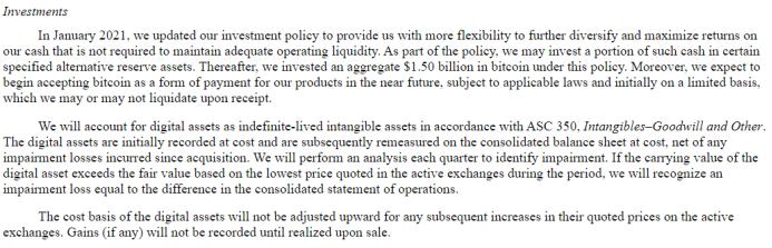 根据特斯拉2020年财报原文显示——【购买的比特币根据会计准则汇编(ASC)350条,无形资产–商誉和其他将数字资产记为无期限无形资产。数字资产最初按成本入账,之后在扣除自购买以来产生的任何减值损失在合并资产负债表上重新计量。我们将每季度进行一次分析以识别减值。如果该数字资产的账面价值超过了该期间活跃交易所报价的最低价格的公允价值,我们将在合并业务表中确认减值损失。】