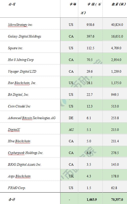 我们在今年发布的《全球区块链产业全景与趋势年度报告(2020-2021年度)》中曾进行调研分析。根据BitcoinTreasuries数据,截止2020年末,目前全球有15家上市公司自行购入并持有超7万枚BTC,其中12家位于美国或加拿大。持币量最高的Micro Strategy 2020年以来持续购入加密资产,并于12月12日完成6.5亿美元可转债发行,票据净收益用于投资BTC,该笔可转债被超额认购近1亿美元。截止目前,统计范围内上市公司持币总数已超10万枚,按4.68万美元现价折算合计价值近47亿美元。