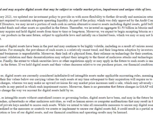 另一方面,特斯拉此举也存在一定的风险,主要体现在监管及财报录入上。根据10K文件Item 1A对风险预判的提示,除BTC在技术上可遭受攻击等因素外,目前美国证券法尚不明确对应资产处理的方法:由于BTC目前并不属于“证券型”资产,美国证监会(SEC)尚未针对上市公司购买存储行为作出细则规定。另一方面,尽管特斯拉根据ASC将其归类为无形资产,但US GAAP准则下并无对虚拟资产的财报归类作出明确指引,未来也存在更换核算方式引起的企业损益变化。