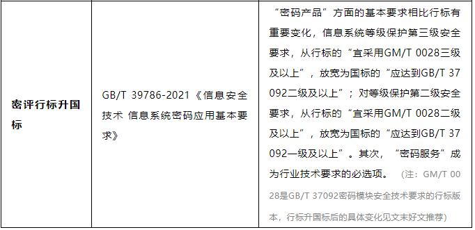 2021年3月9日,GB/T 39786-2021《信息安全技术 信息系统密码应用基本要求》(以下简称“国标”)国家标准正式发布,实现了行业标准上升为国家标准,其中对密码软件要求进行明确,GM/T 0054-2018《信息系统密码应用基本要求》(以下简称“行标”)的指标“密码模块实现”改进为国标“密码产品”,并增加了“密码服务”。“密码产品”方面的基本要求相比行标有重要变化,信息系统等级保护第三级安全要求,从行标的“宜采用GM/T 0028三级及以上”,放宽为国标的“应达到GB/T 37092二级及以上”;对等级保护第二级安全要求,从行标的“宜采用GM/T 0028二级及以上”,放宽为国标的“应达到GB/T 37092一级及以上”。(注:GB/T 37092是GM/T 0028密码模块安全技术要求的国标版本),放宽了密码产品的入市标准,将进一步促进密码软件市场发展。《商用密码应用与安全性评估》发布,我国商用密码服务能力逐渐提升,商用密码产业结构逐渐优化,利好软件形态密码产品发展。