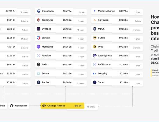 而在Chainge中,您可以同时获得所有链上的所有DEX的流动性,这就是我们能够聚合超过700亿的流动性,并成为市场上流动性最充足的多链跨链聚合DEX的原因!
