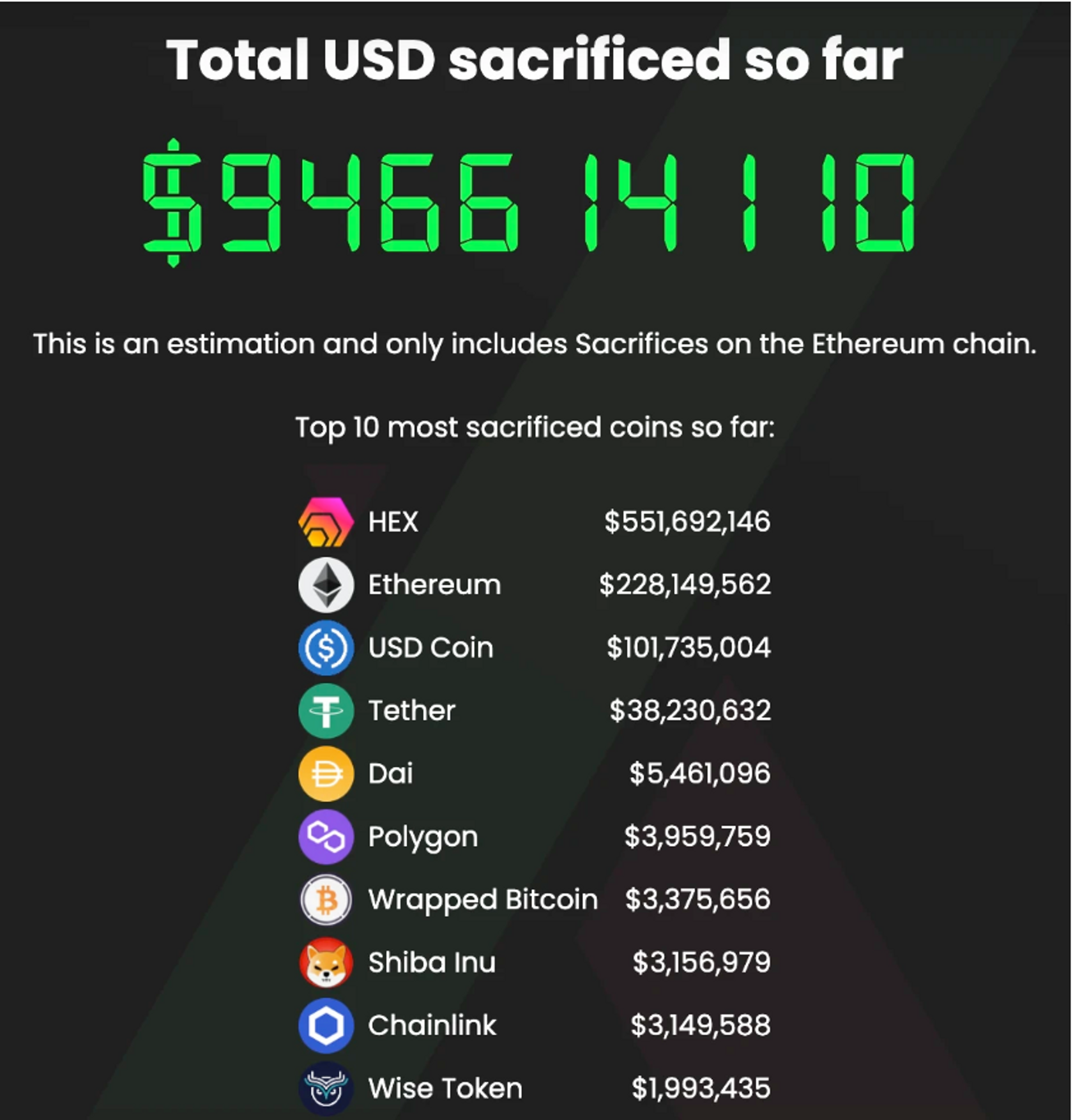 PulseChain采用Sacrifice的方式进行融资,"Sacrifice" 活动是号召社区为了共同信仰去无偿提供自己手中的加密货币的活动。而这种融资方式金额到达了惊人的不到十亿美元。第一阶段的结束时间是在2022年1月10日