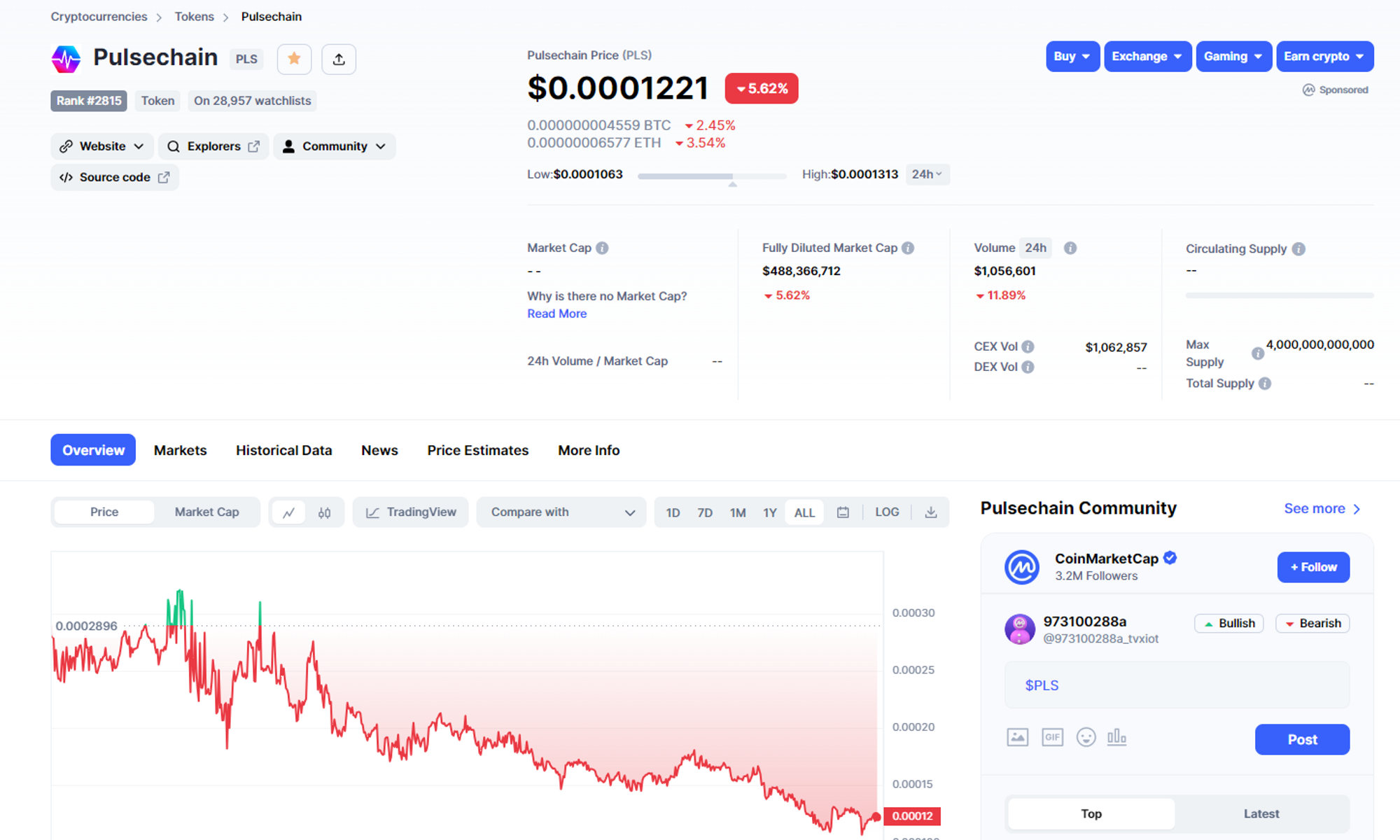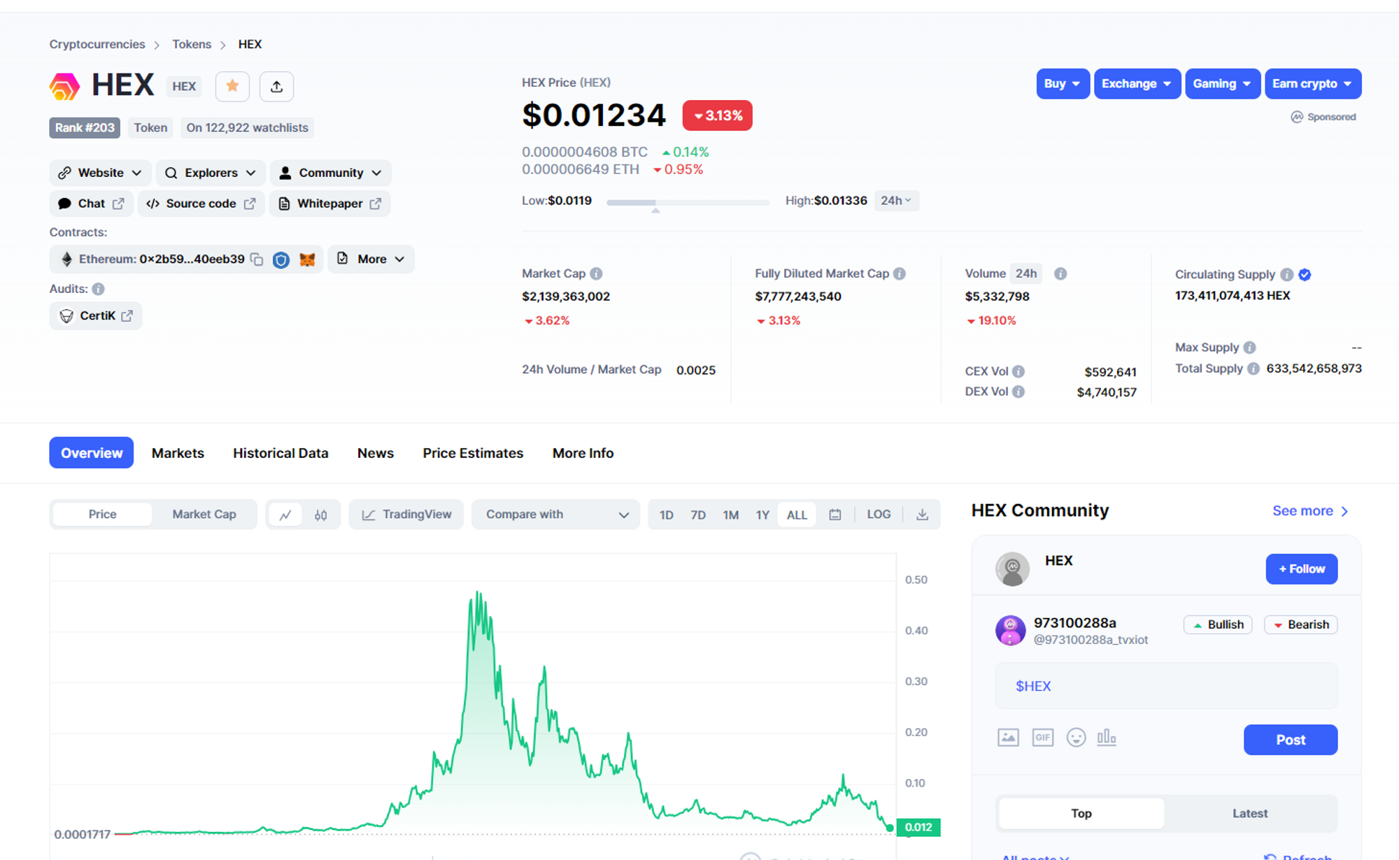 不管是Pulsechain 还是$HEX,市值都相对较高。从链上数据来看大量的代币目前还处于锁定状态,但是即便如此流通市值依旧较高,已经超越了一大部分早期热门项目。但是我们从$HEX的波动来看,发生过多次几乎归零,但又上涨回来,最高到达$0.55.社区共识较高。