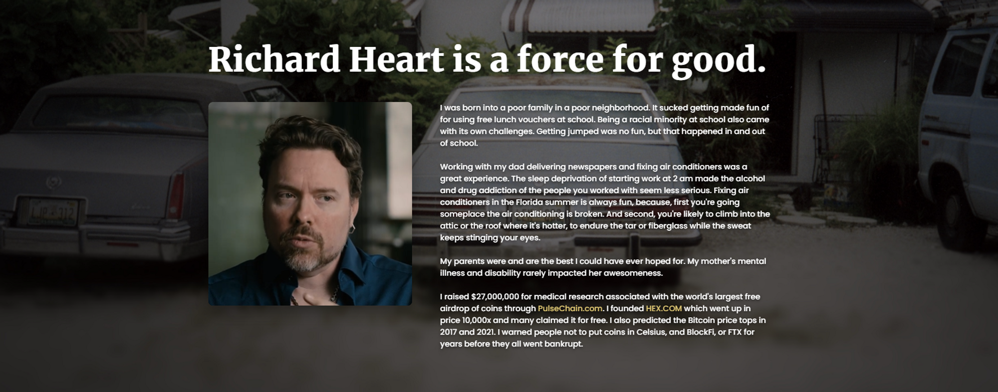 创始团队信息较少,目前明面上能看得到的是Richard Heart,他是$HEX的创始人。也是一位连续创业者,其中抵押贷款公司,在其领导下最高一年赚取6000W美元利润。通过 PulseChain 网络筹集了超过 2700 万美元用于医疗研究,个人网站单月浏览量过万次。