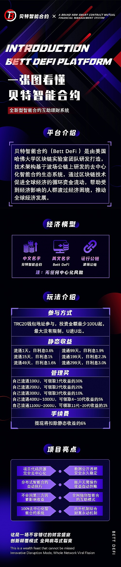 贝特智能合约,去中心化互助金融6月启航英文: Bett DeFi 中文: 贝特智能合约 去中心化互助金融的简称贝特DEFI智能合约 贝特智能合约由美国哈佛大学区块链实验室团队研发的贝特智能合约,架构基于波场公链上研发的去中心化智能合约生态系统。通过区块链技术促进全球经济的循环资金流动,帮助全球经济影响的人群,渡过经济困境。贝特是一个以智能合约互助为特色的创新、独特和可持续的互助体系,这是一种全新的互助模式,贝特理财计划在任何互助体系中都是前所未见的!贝特理财计划100%去中心化智能合约系统运行在TRC20 TRON公共链底部的DeFi-Dapps系统。自动内部机制+强大的外部机制=金融永动机计划。