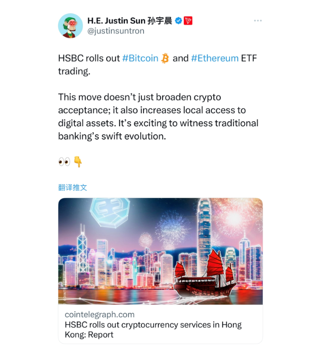 针对香港汇丰银行推出比特币和以太坊ETF交易服务,波场TRON创始人、火必Huobi全球顾问委员会成员孙宇晨发推表示,此举不仅拓宽了加密货币的接受度,同时也增加了当地对数字资产的获取渠道。