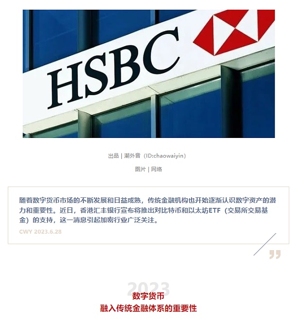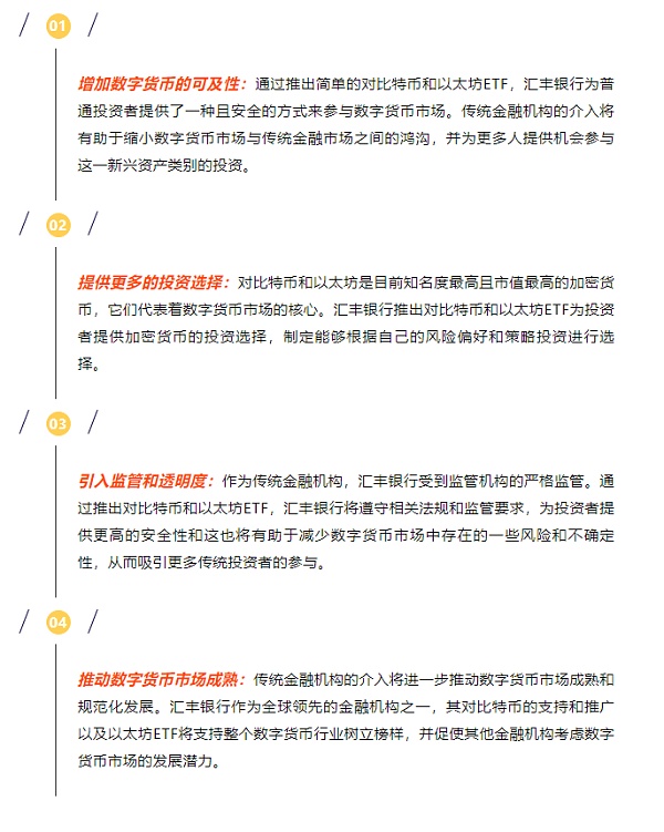 汇丰银行推出对比特币和以太坊ETF的支持对数字货币进一步发展传统金融体系的重要里程碑。