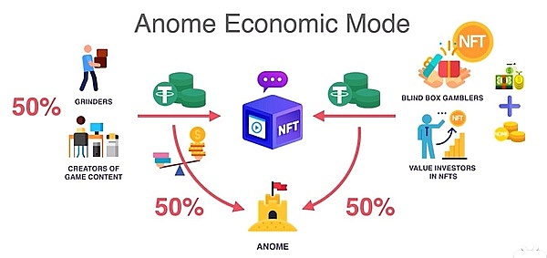 这种模式将服务于两种类型的中度用户:搬砖党和游戏内容的创作者归为一类;盲盒赌徒、 NFT 的价值投资者、ANOME 的高度信仰者归为另外一类。搬砖党和游戏内容的创作者通过 支付 USDT 完成 NFT 的确权铸造(杠杆参数的设计实际可以形成低成本高收益),盲盒赌徒 和 NFT 的炒客通过支付 USDT 开启盲盒获取 NFT 赚取未来的版税分成。并且可以随机获得 Nome 积分,放大了整体的博弈乐趣。ANOME 平台从中度用户的基础动作中获得 USDT 现金 流收益。平台收取玩家支付的 USDT 的 50%作为技术服务费,剩下的 50%进入盲盒铸造者的 钱包地址。开盲盒的玩家除了获得 NFT 外,还可以按照一套标准算法获得随机数量的 Nome 积分。