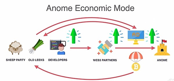 对于这些轻度用户,ANOME 提供了空投广场(糯米广场)的功能。在这个层级群体中,一般有三种角色:羊毛党、老韭菜和开发者等垂直用户属于一种;Web3 的其他合作方算一种; ANOME 的平台算一种。这些角色之间形成了正向循环经济模型。Web3 项目方向 ANOME 提 供广告内容和空投代币。