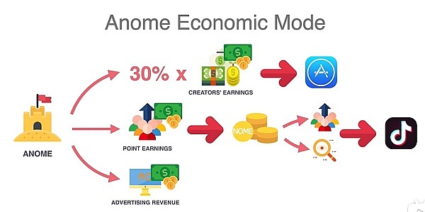 在这个循环中,所有的价值都围绕 ANOME 平台的 Nome 积分进行流转。而在这个环节,平 台的现金流来源包括:首先,游戏创作者的收益分成(30%),类似于应用商店的模式;其次, 游戏推流的积分收益。游戏创作者为了让自己的游戏在成千上万个 ANOME 平台上的游戏中 得到更多玩家的关注,需要抵押或支付一定积分来获得更高的推流和更多的曝光度,类似于抖 音的算法;第三,在整个游戏过程中嵌入一些广告,从中获得广告收益。