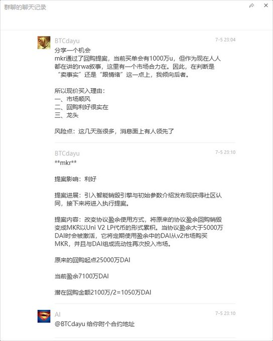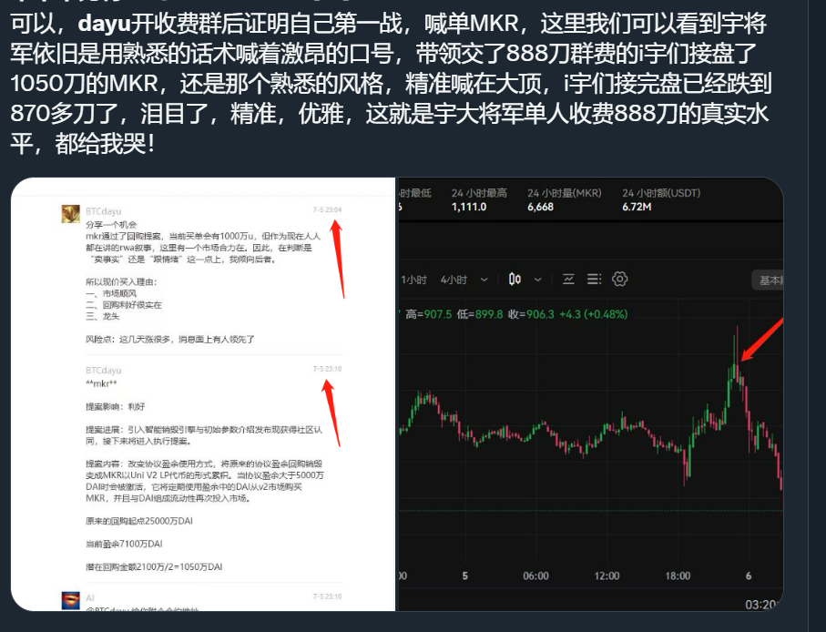 dayu开群后第一个项目就是mkr,刚刚买入没有多久,mkr雪崩,从1020刀跌至870刀,然后就被人爆出来,具体信息看图。