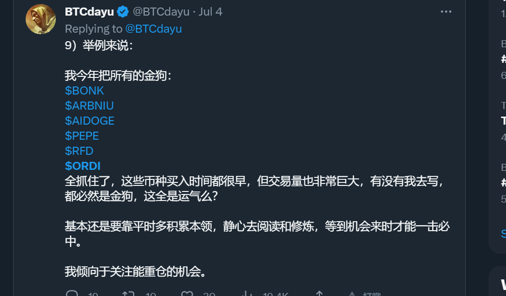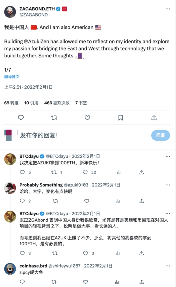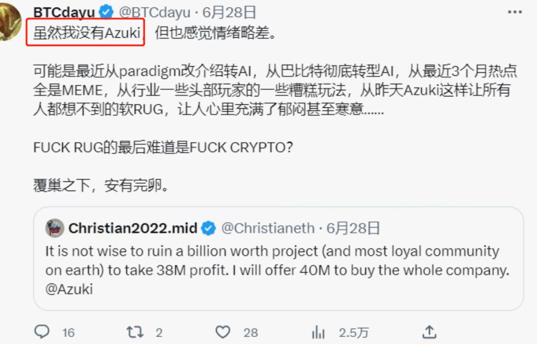 那他是怎么突然就把好好的人设崩了的呢,还得从azuki说起,azuki项目方搞了一批同质化的nft卖了20000个eth,随后迅速转账走了,全网对azuki项目方一堆骂声,随后dayu就发推说自己没有持有azuki,对此表示遗憾,随后一位细心的网友扒出了,dayu喊单azuki100e的推特截图,然后呢都开始纷纷怀疑dayu人设造假,营造了一种虚假的永赚大师形象。