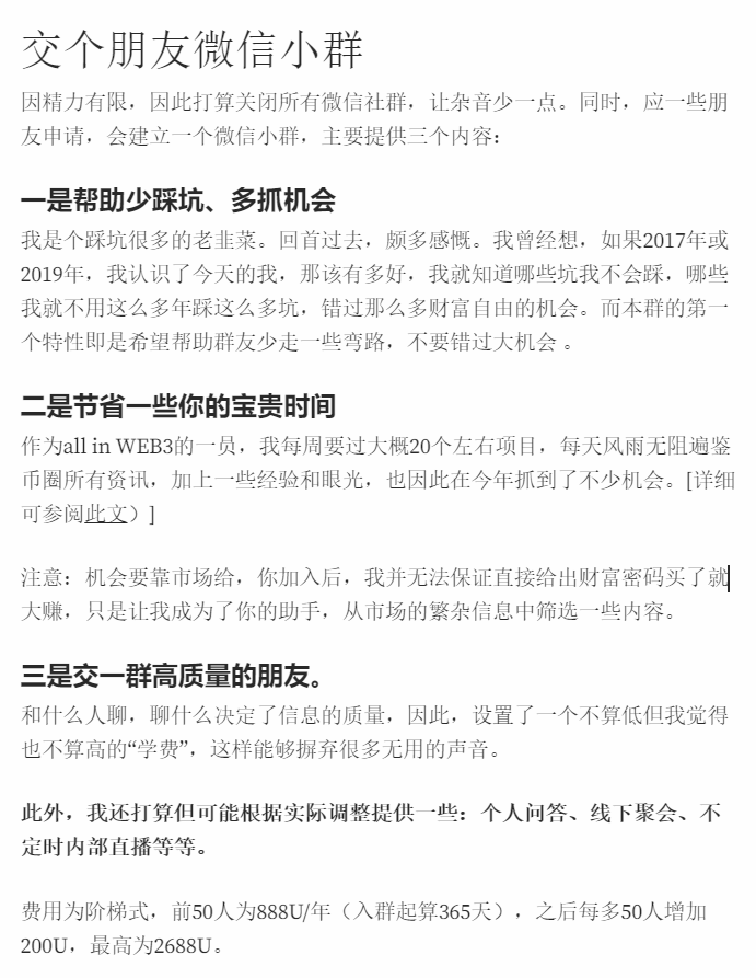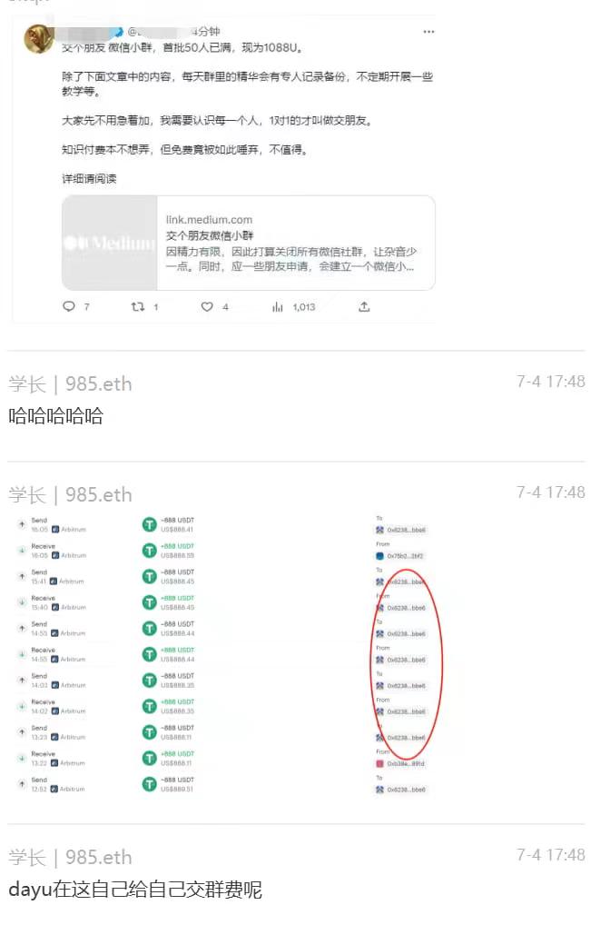 到这里还没有完,没有几天又上演了一出大戏,dayu开收费群了,每个会员888u,随着人数增加不断加价,没有多久他就宣布50人的小群满了,到了晚上就有人扒出了链上记录,dayu通过链上给自己打了不少888u的转账,关键地址都一样,把用户当白痴,然后就有了开头的一幕。
