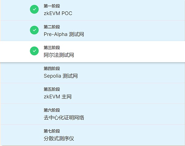 Scroll 正在建立一个 EVM 等效的 ZK Rollup,其设计决策遵循安全性、效率、EVM 等效性和去中心化,其架构由 Scroll 节点、链上的智能合约、去中心化的证明器网络三部分组成。 Scroll 当前已经完成了预 Alpha 的测试网,接下来第二阶段将邀请开发者基于其网络部署一些智能合约,并且开发一些额外的应用;第三阶段将启动二层证明的外包,邀请社区参与成为证明节点;第四个阶段到达 zkEVM 主网阶段,将在经过严格的代码审计以及性能提升后部署并且上线主网;第五个阶段将部署去中心化的排序器,从而使得 zkEVM 更加高效。(官网做了一些调整)