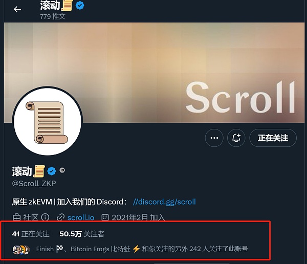目前scroll社区运营效果还是非常棒的,推特关注人数超过50万人,推文流量也还是不错的,保持强劲的发展力,生态发展也是在稳步进行中,与他们合作的项目方也是不少,质量总体都还是可以的,dc人数也达到了惊人的50万区间,可以说这是一个非常成功的项目了,相信后续发展也将取得更大的进步。