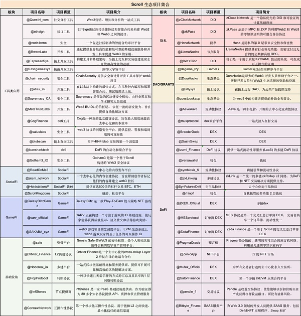 虽然目前还是测试网,但上面的生态发展非常不错,有近百款dapp与scroll合作,项目生态百花齐放,知名项目方不少,各个分类。DAO,GAMEFI,SOCIALFI,DEFI,DEX,钱包等布局明显,整体建设还是比较不错的,aavx,sushi,SecondLive等正在成为生态主力军,期待更多项目来scroll发展。
