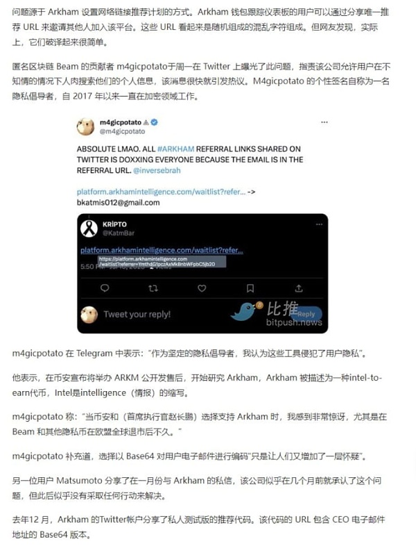 加密数据公司Arkham Intelligence周一宣布推出一项旨在揭露数字钱包所有者身份的新服务,引发了争议,激怒了注重隐私的加密倡导者。 Arkham建立其webblink推荐项目的方式。Arkham钱包追踪仪表板的用户可以通过分享他们唯一的推荐URL来邀请其他人进入该平台。这些url似乎以一堆无意义的字符结尾。实际上,它们是用Base64编写的用户电子邮件地址的一种易于破译的版本,解码起来很简单。 匿名区块链Beam贡献者m4gicpotato在推特上发布了这个问题,并迅速传播开来。M4gicpotato称自己是一名隐私倡导者,自2017年以来一直以各种名义从事加密工作。他表示,作为坚定的隐私倡导者,我认为这些工具侵犯了用户隐私。