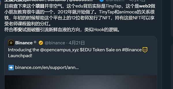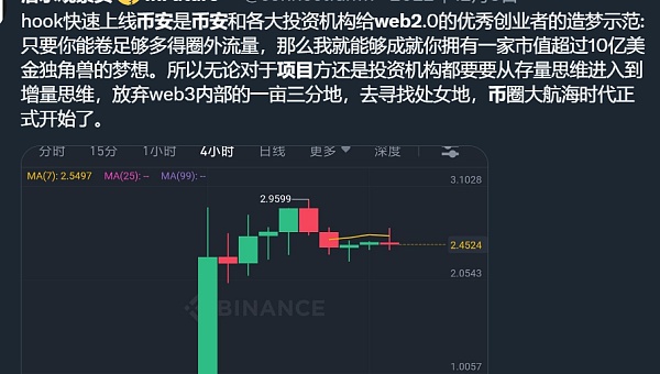 币安进来新上项目,很多都是web2背景大厂出来web3创业的,币安上线,也是看能不能带来新的流量,总得来说就是币圈的人数太少了,需要新鲜的血液输血,整体市场也是疲软状态,币安的EDU,HOOK,PLAYBUXCO都是来自web2创业,本身也是有产品与服务的,进入web3的时候,带来了web2的用户,未来可能我们会看见越来越多的web2背景的大厂进来,市场竞争将会越来越残酷,因为拥有丰富web2背景,资源的人,他们能够带来的流量与资源,比web3纯创业者好太多。