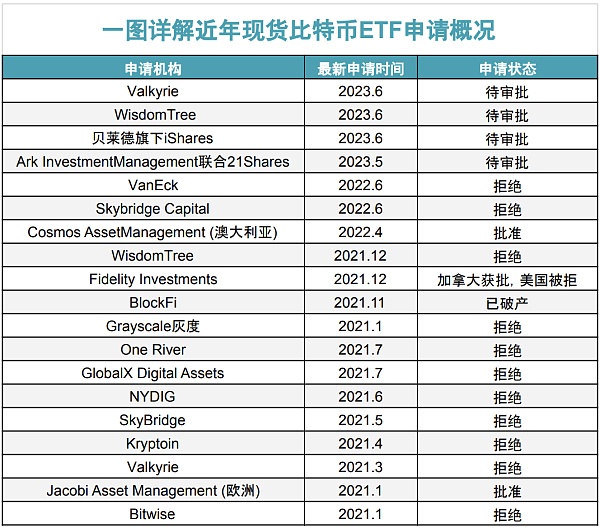 - 据不完全统计,2021年至今已有19家机构申请了现货比特币ETF,但美国证券交易委员会(SEC)尚未批准任何一家的上市申请。