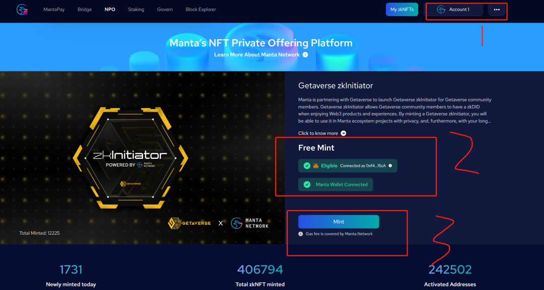 2.领取Getaverse zkInitiator 打开下边的网站,连接好manta钱包点击验证持有者,然后连接小狐狸钱包接下来点击mint,钱包确认就可以了
