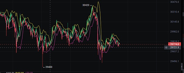 午夜的下跌行情同样如此,毫无理由的一波下跌,坚定地穿破了29600附近的位置,然后再次进入横盘状态。