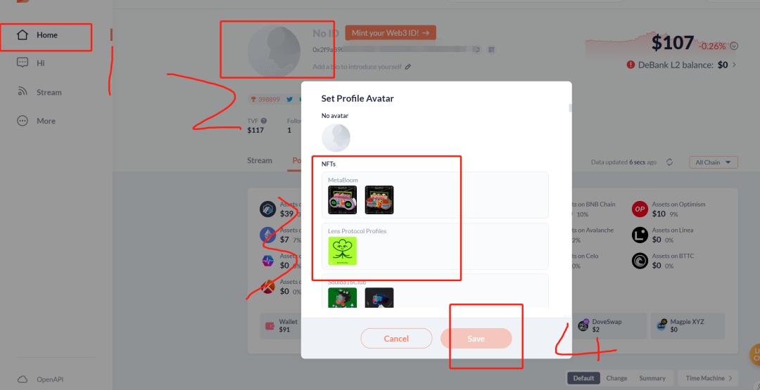 第七步,添加NFT头像,点击灰色头像按钮 ,选择你持有的NFT作为头像,保存即可