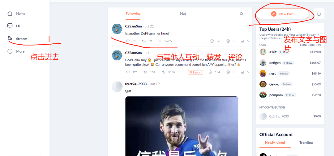 第三步发文与其他人互动,点击Stream进去,多发一点文字,图片,每隔一周左右刷一下,转发,评论也可以刷一下。