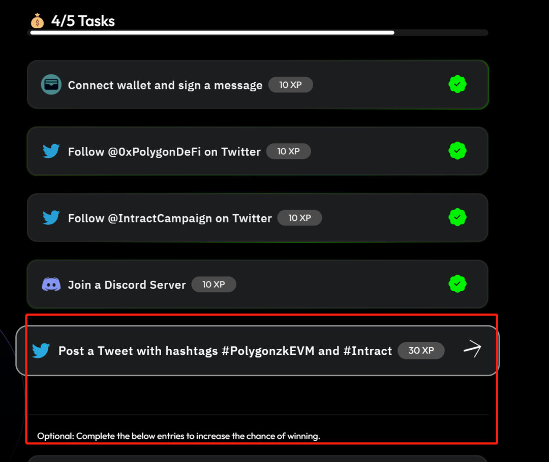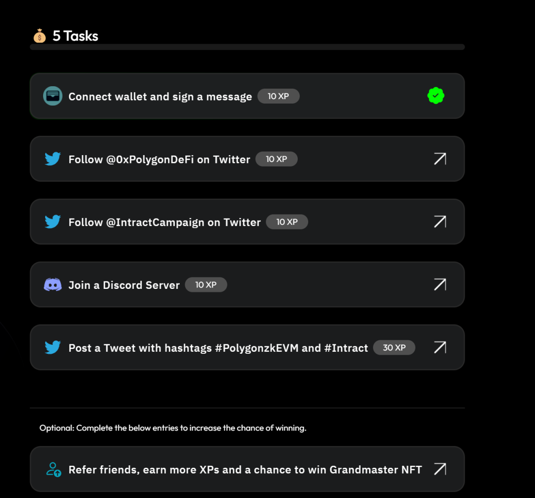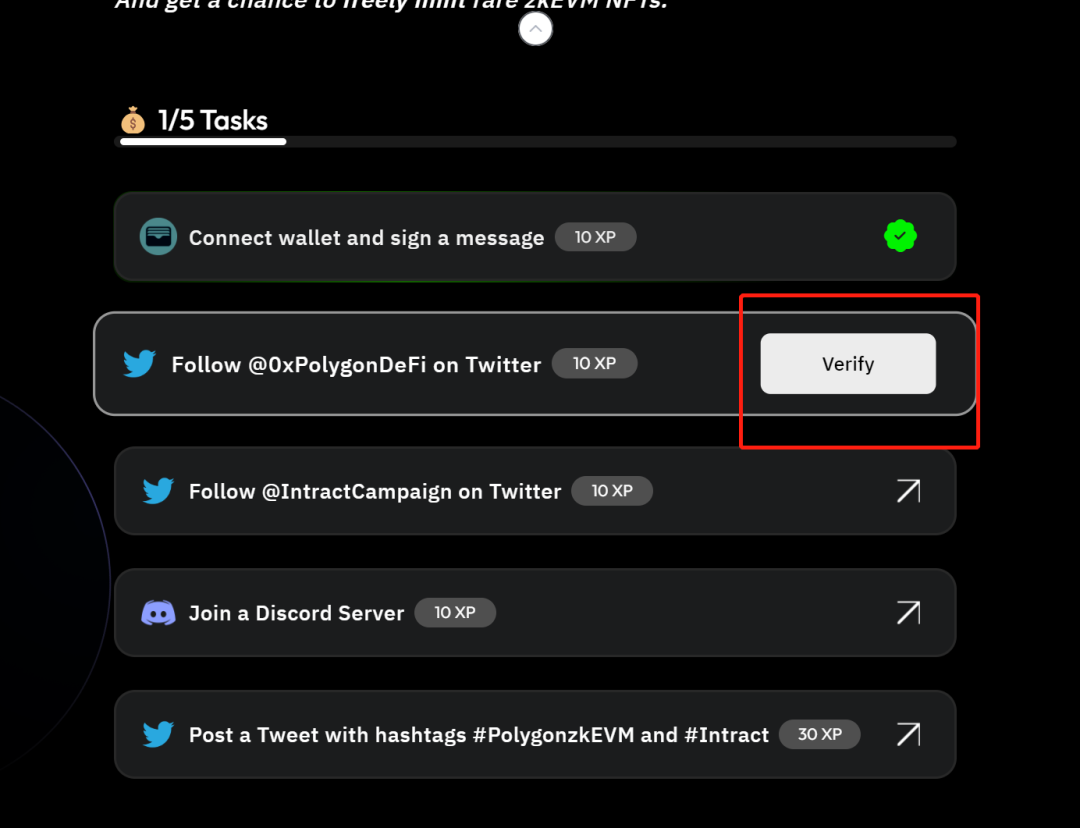 第二步开开始做任务,一共5给任务,第一个任务是验证钱包很简单,点击钱包确认就行。https://quest.intract.io/quest/64b7a6b0b549e0360fa6456d?userRef=1tshxn
