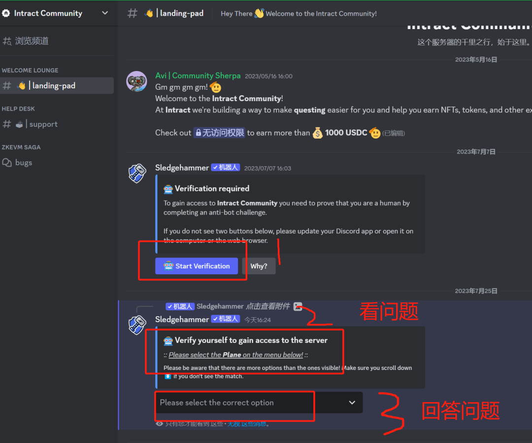 然后是加入dc,进去以后,点击小机器人开始验证,然后第二步下面会提出问题,第三步回答问题,选中下面的内容即可,回去再次验证。