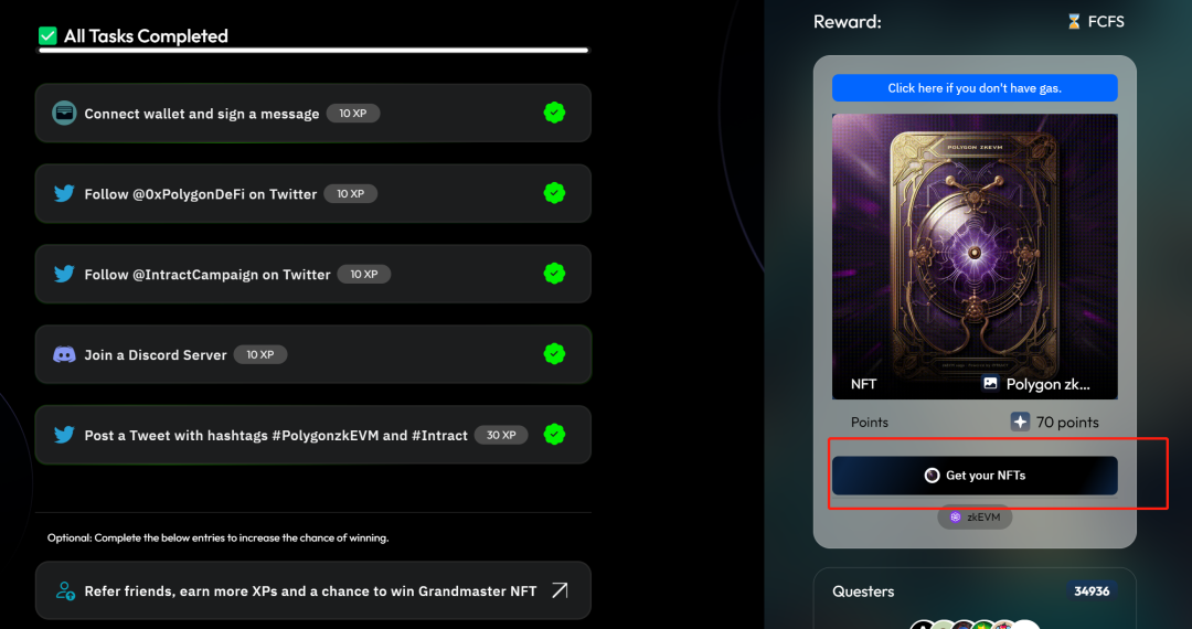 返回看左边任务全部都是绿色的就成功了,然后点击红框领取nft即可